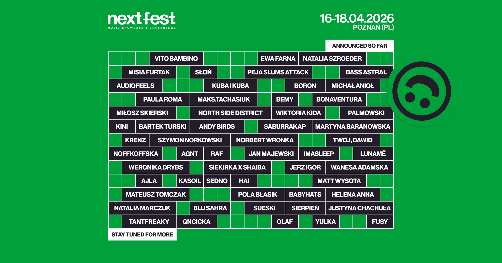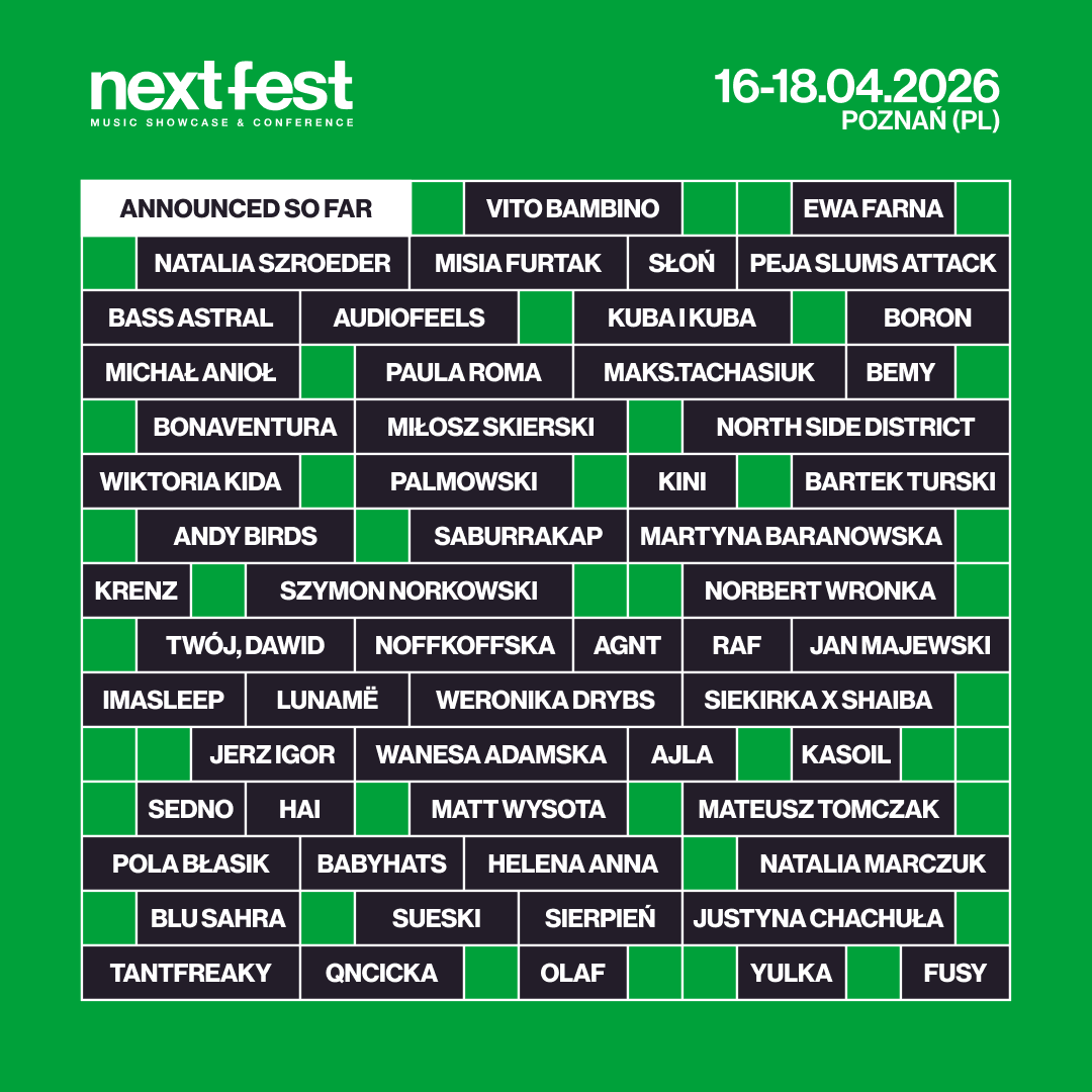 NEXT FEST Music Showcase & Conference wraca do Poznania 16-18 kwietnia. Karnety są już w sprzedaży, a kolejne ogłoszenia programowe przed nami. Szczegóły: www.nextfest.pl.
