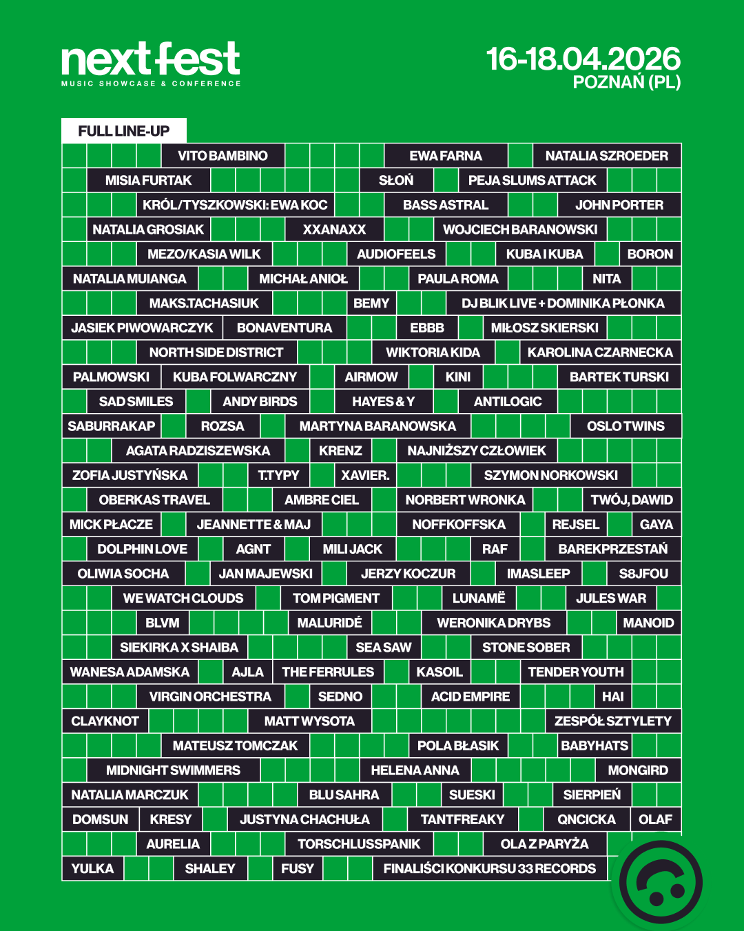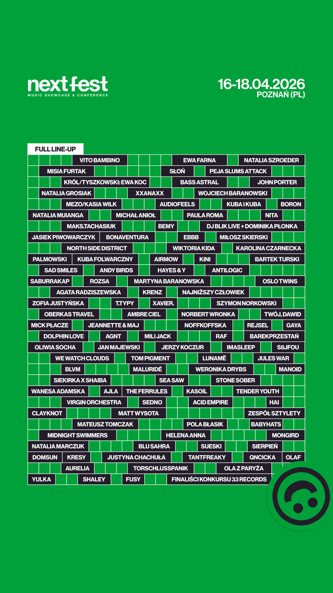 Znamy już prawie wszystkich, ale emocje będą trzymać do samej wiosny. Wciąż trwa konkurs 33 Records, w którym stawką jest kontrakt płytowy – trójka finalistów dołączy do programu festiwalu, a ich nazwiska poznamy po 15 marca. Czekamy też na finał NEXT AWARD. Kto pójdzie w ślady Wiktora Dyduły? W tym roku to Wy wybierzecie zwycięzcę na nowych zasadach, a na najlepszy zespół czekają nagrody. Do zobaczenia w Poznaniu!